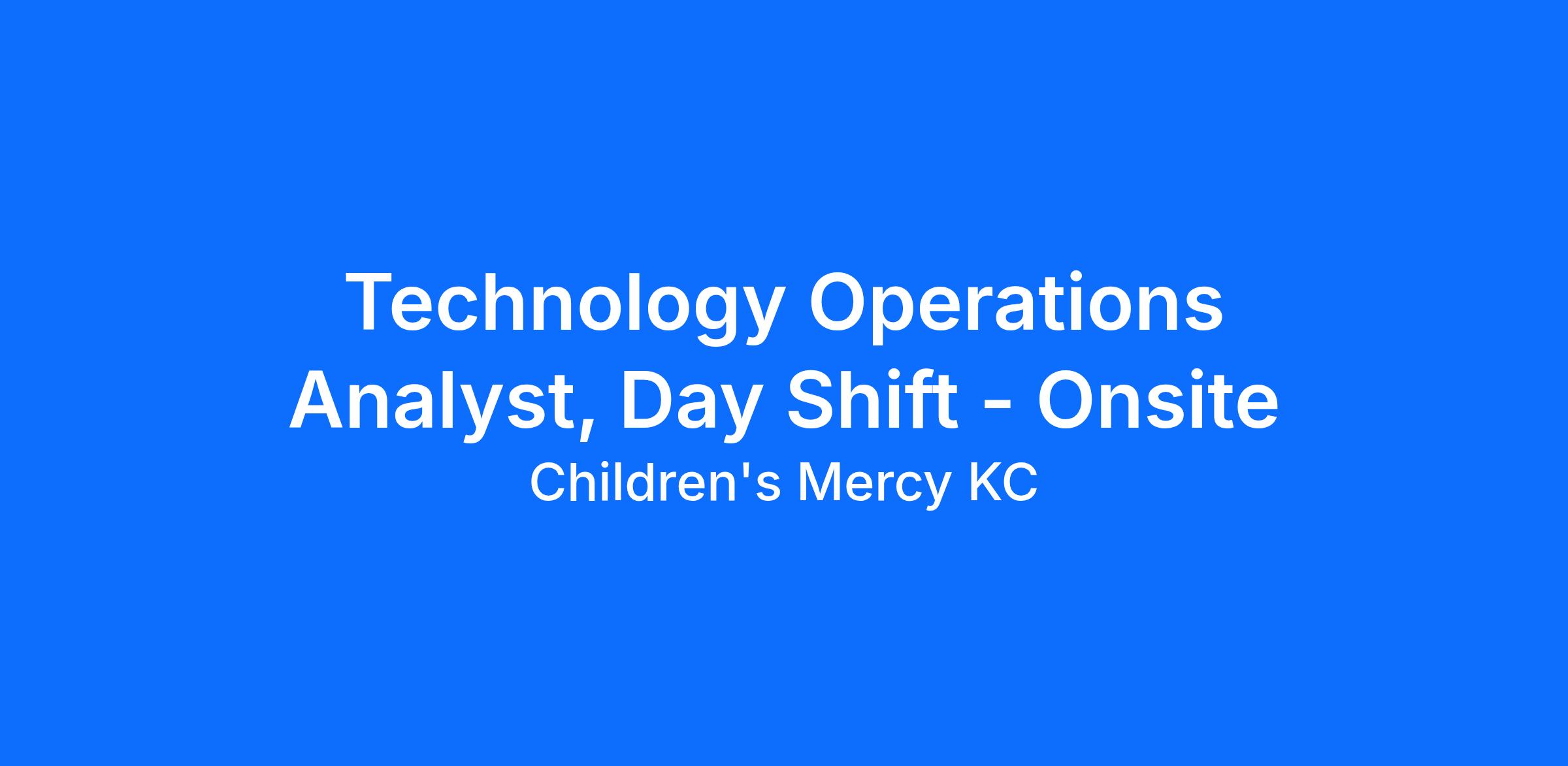 This is an onsite role at the main campus in Kansas City. Day Shift: 4, 10-hour shifts, M-F with weekend rotations.