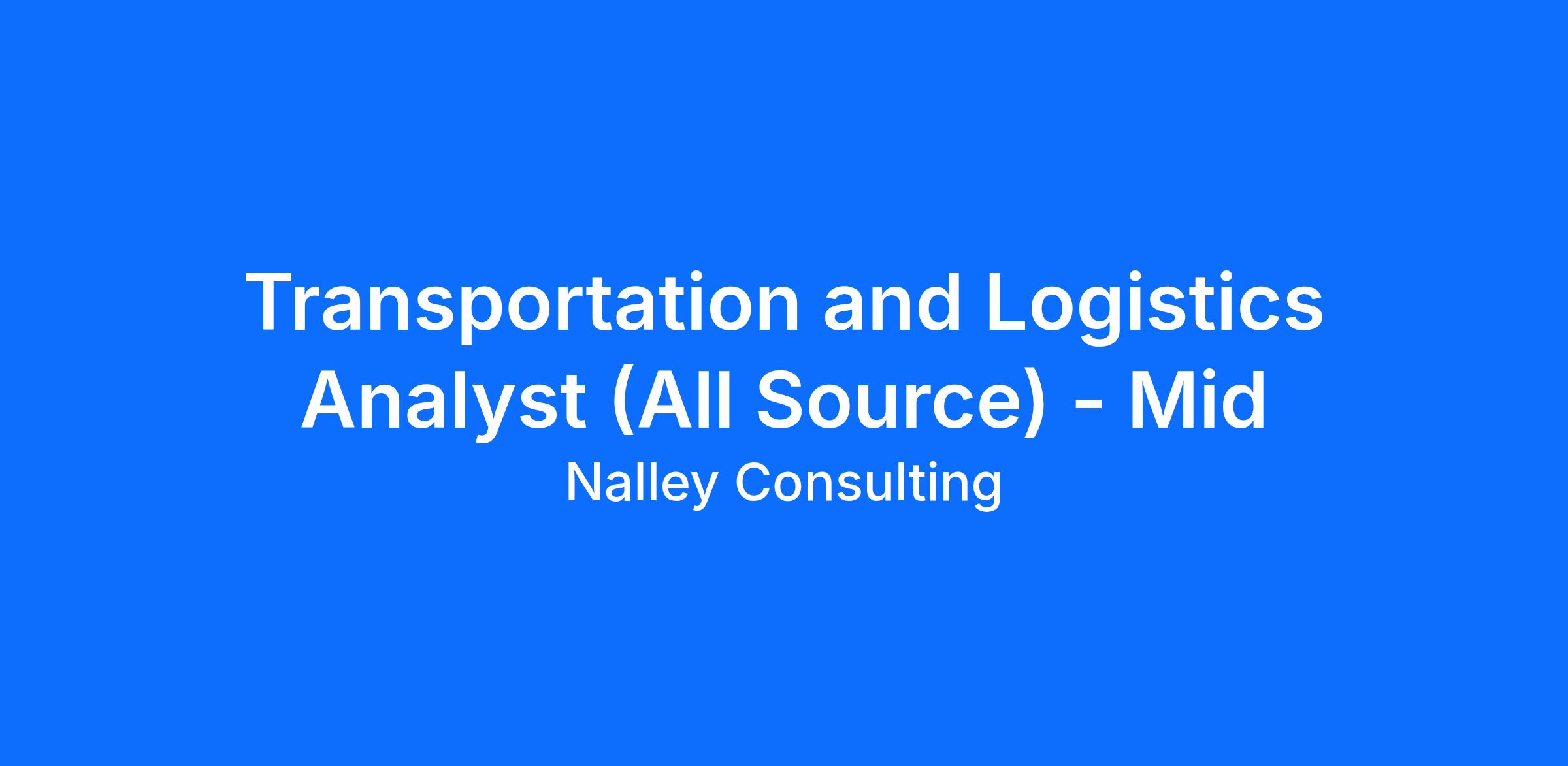 Join the Nalley Consulting team as a Transportation and Logistics Analyst (All Source).Position: Transportation and Logistics Analyst (All Source) - Mid