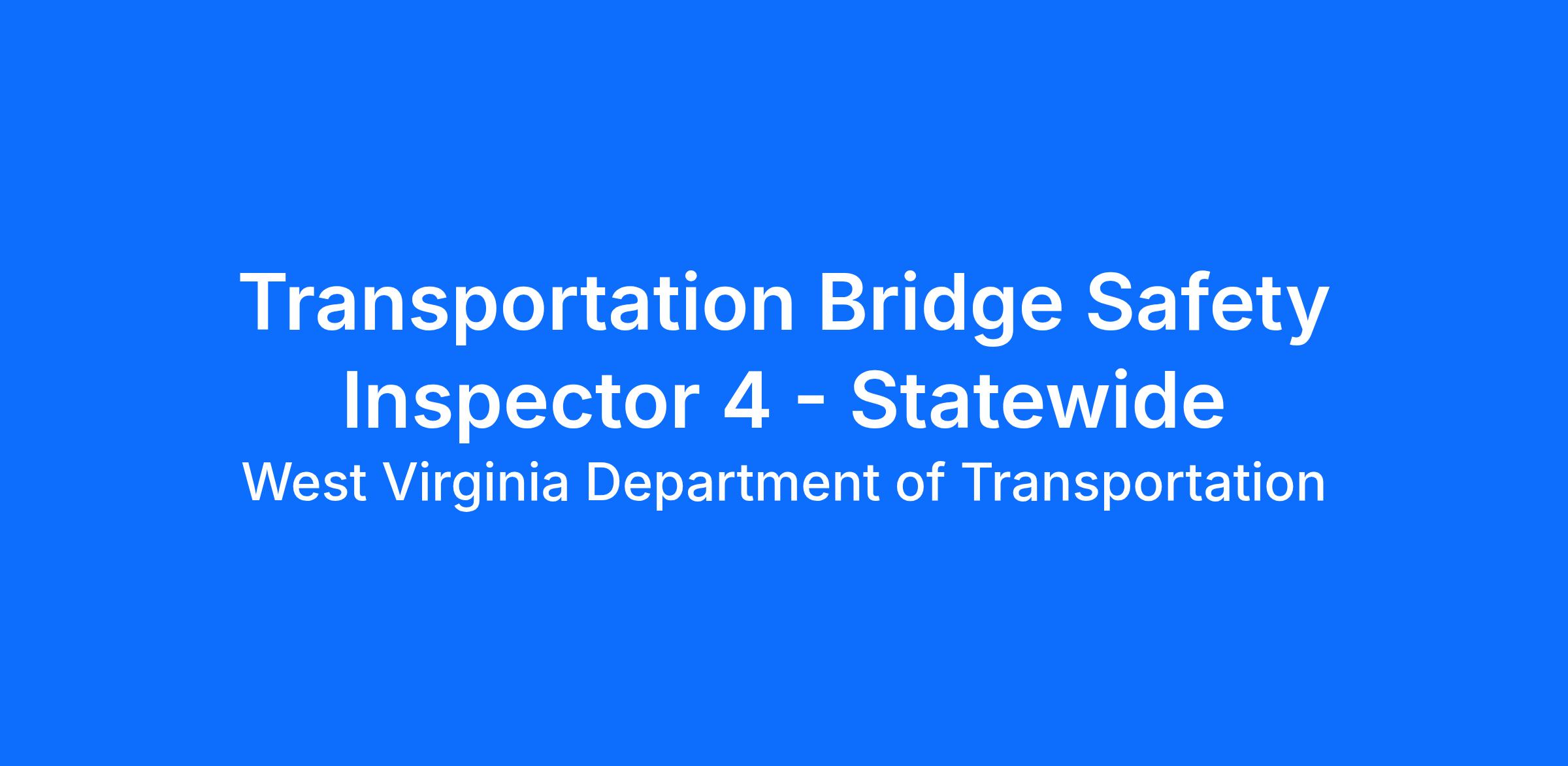 The Transportation Bridge Safety Inspector 4 will report to the Operations Division in Kanawha County, while serving statewide. The selected employee performs advanced level bridge safety inspection and analysis work and supervises the performance of a bridge safety inspection team. May perform strenuous physical labor. Hazardous working conditions involve climbing on the superstructure and substructure of bridges. The work may involve exposure to severe weather conditions. Performs related work as required.