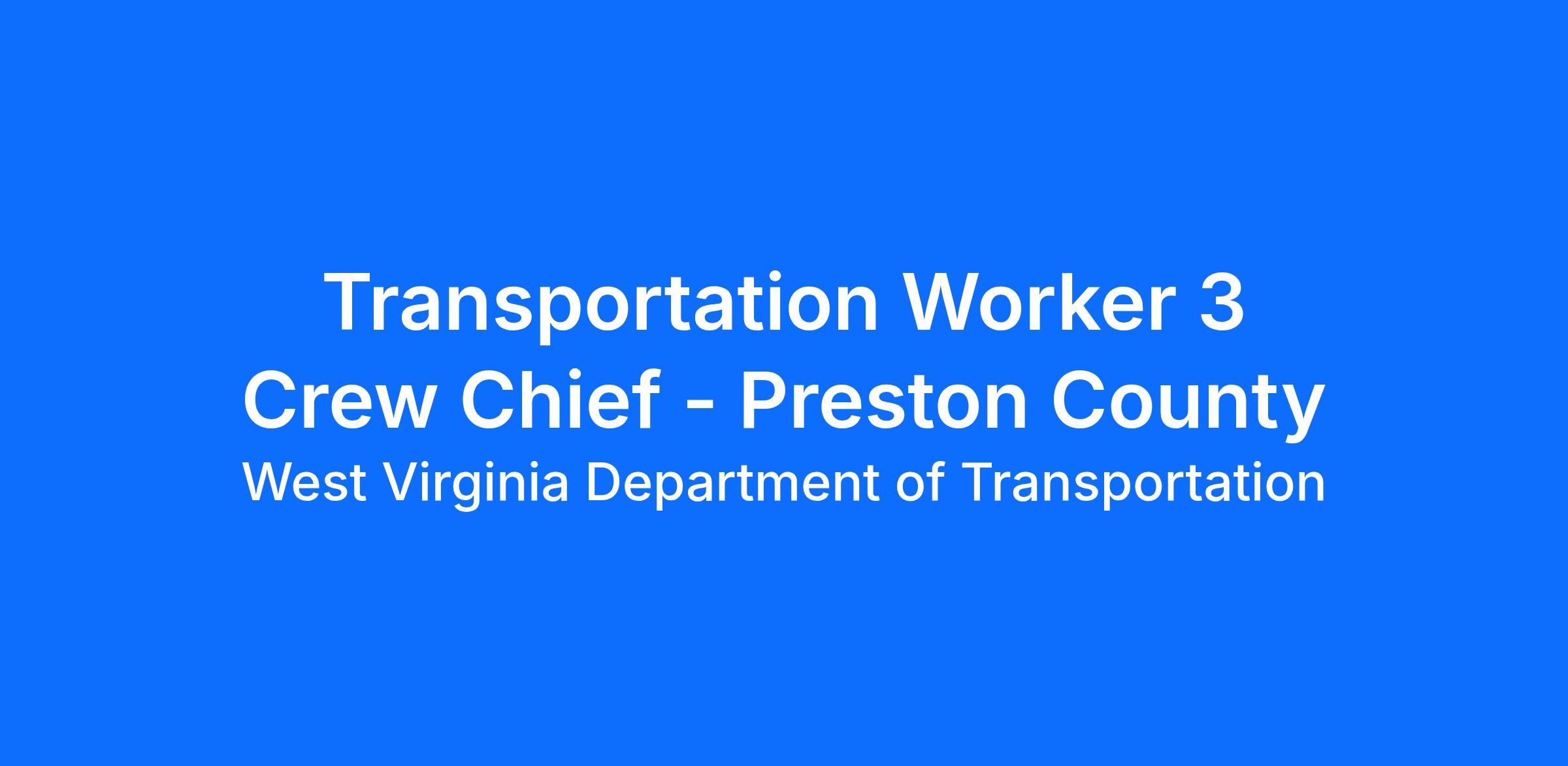 The Transportation Worker 3 Crew Chief will report to the Preston County Headquarters. The selected employee, under limited supervision, will act as a working crew leader, leading a crew participating in the maintenance and repair of highways. Investigate citizen complaints to determine the repairs and materials needed. Participates in meetings to determine the assignment of crew members to daily projects and oversees the completion of work. Completes reports concerning time, materials, and inspection of work done. Will be required to become certified on one or more of the following types of equipment: hydraulic crane, grader, bulldozer, backhoe, track/rubber-tire excavator, or welding unit. May be exposed to inclement weather and hazardous working conditions. Performs other related duties as required.