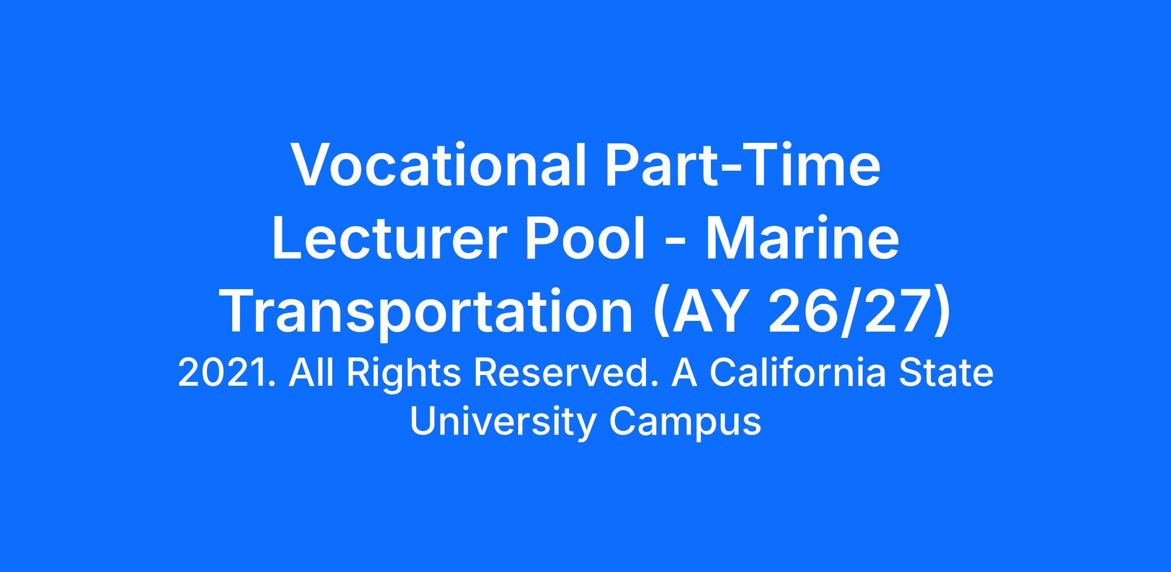 Marine Transportation - PART-TIME VOCATIONAL LECTURER POOL. The Marine Transportation Department within the College of Agriculture, Food and Environmental Sciences at California Polytechnic State University Maritime Academy (Cal Poly Maritime) is seeking applications for a pool of part-time vocational lecturers. Located on a compact, scenic waterfront campus in Vallejo, California, Cal Poly Maritime serves approximately 1,000 undergraduates and 50 graduate students and is one of only seven degree-granting maritime academies in the United States—and the only one on the West Coast.