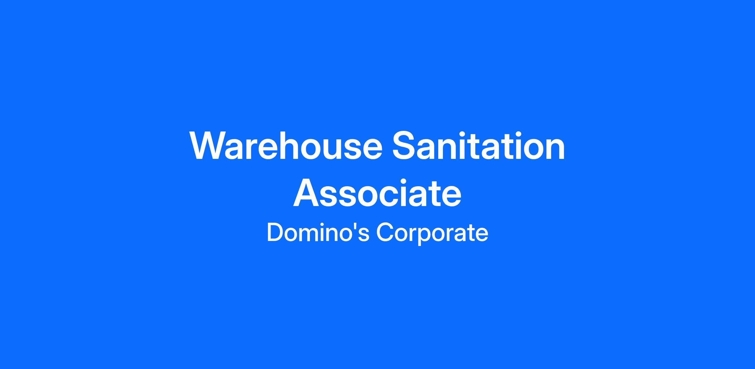 The Domino's Pizza Supply Chain Center is seeking a Warehouse Sanitation Associate to clean and maintain all areas of the warehouse. The Sanitation Associate will be responsible for cleaning the building including outside warehouse dock doors and grounds, maintaining the master sanitation schedule on a weekly basis, and maintaining the pest control log. They will also support all recycling efforts.