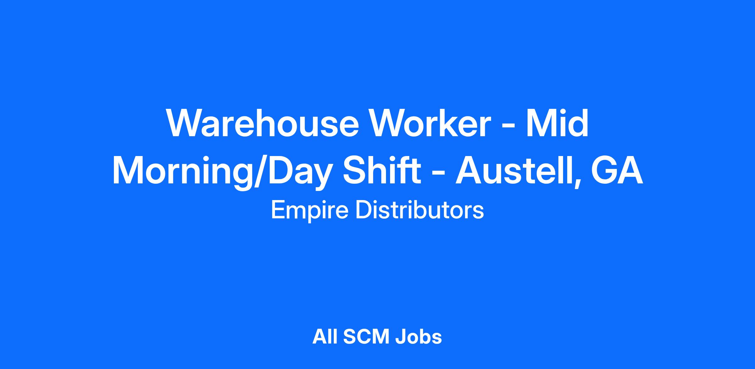 Empire Distributors Inc, A Leading Beverage Distributor is now hiring a Mid-Morning/Day Warehouse Worker in Austell, GA. Our company offers competitive wages, potential growth opportunities, and excellent benefits that include, but aren’t limited to health care, retirement benefits, paid time off, company paid life insurances, and supplemental Aflac and legal plans.